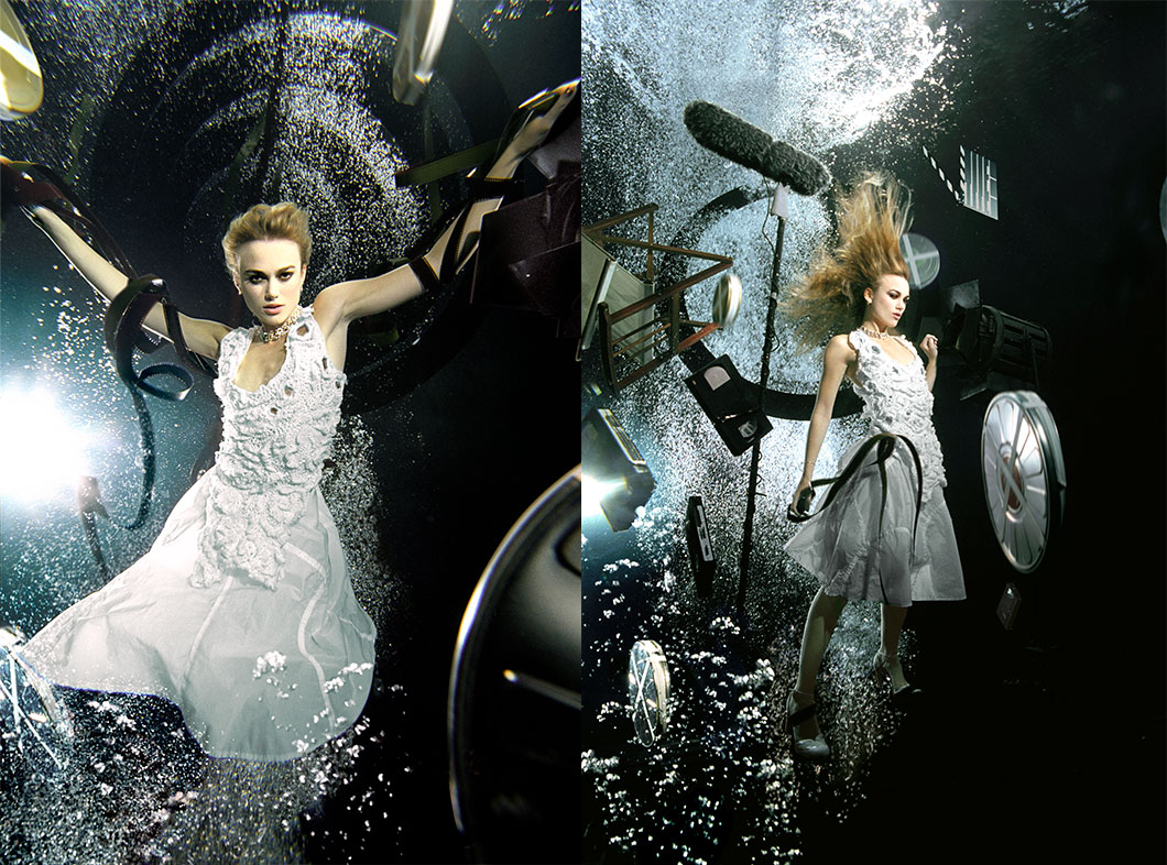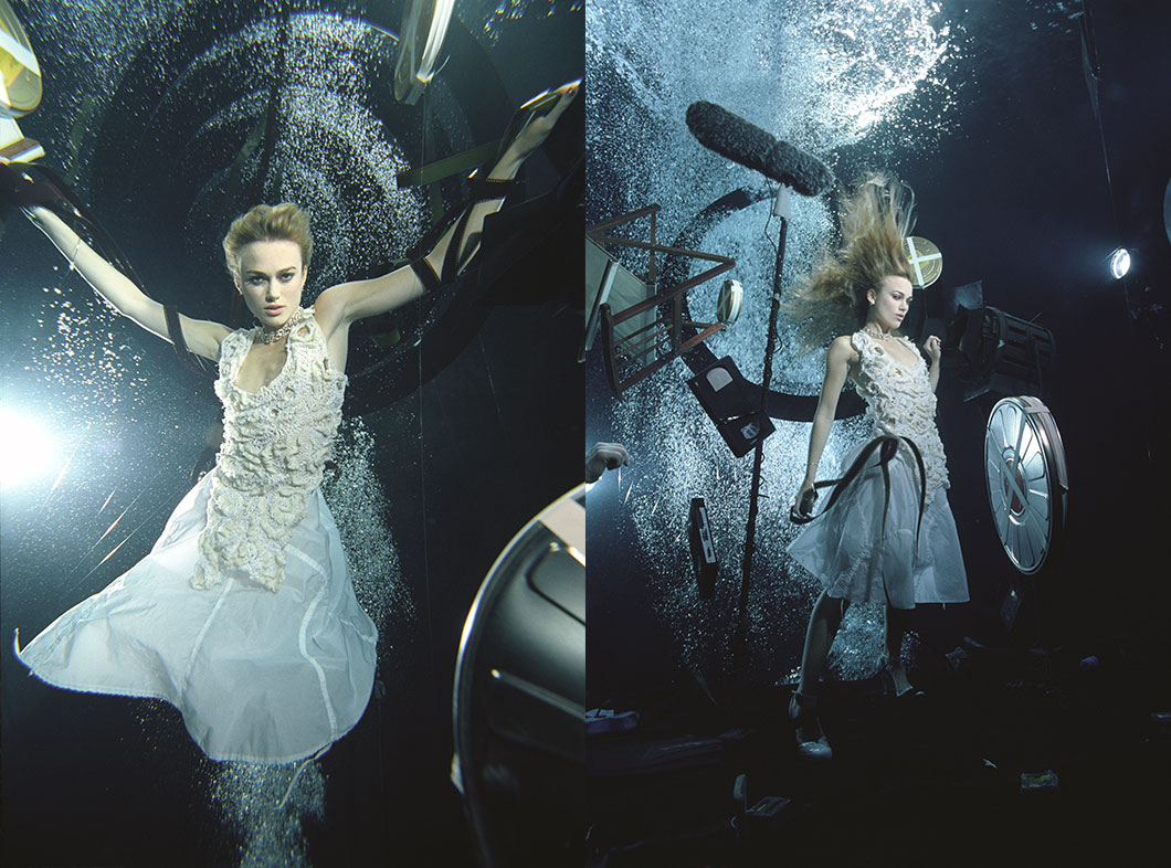A blast from the past! Here’s an image from my first job at a photographic studio. The photographer specialized in underwater fashion and editorial projects. They took this photo of actress Keira Knightley in the underwater tank at Pinewood Studios. Moreover, it was part of a larger series featuring many celebrities for a charity project. The images reflect each individual’s background; therefore, Keira posed with film props.